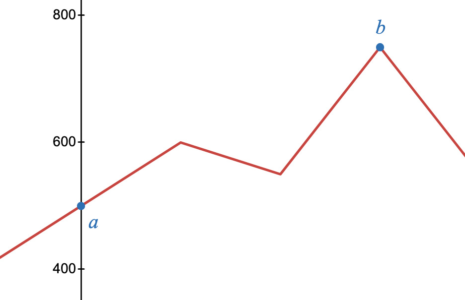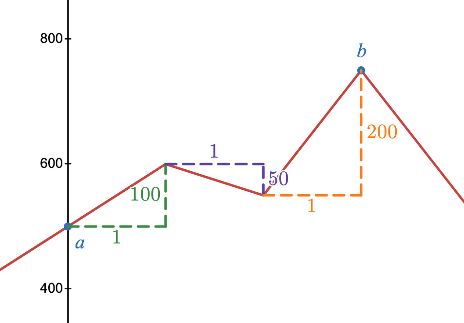 Suppose you’re hiking up a mountain, from point a (x=0) to b (x=3). Naturally, the mountain has varying slopes as you ascend. The big question we want to answer is, what was the overall change in elevation from a to b?
