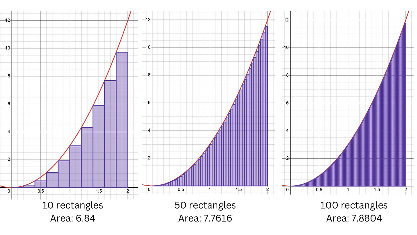 The more rectangles we use, the closer we get to the true area under this curve, which is 8. 8 is the limit of this sequence of areas.